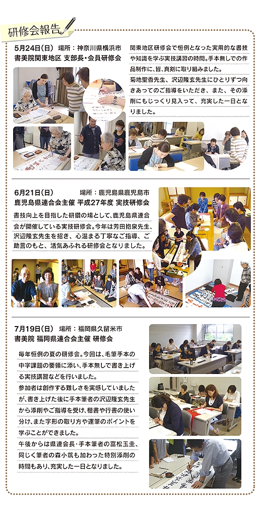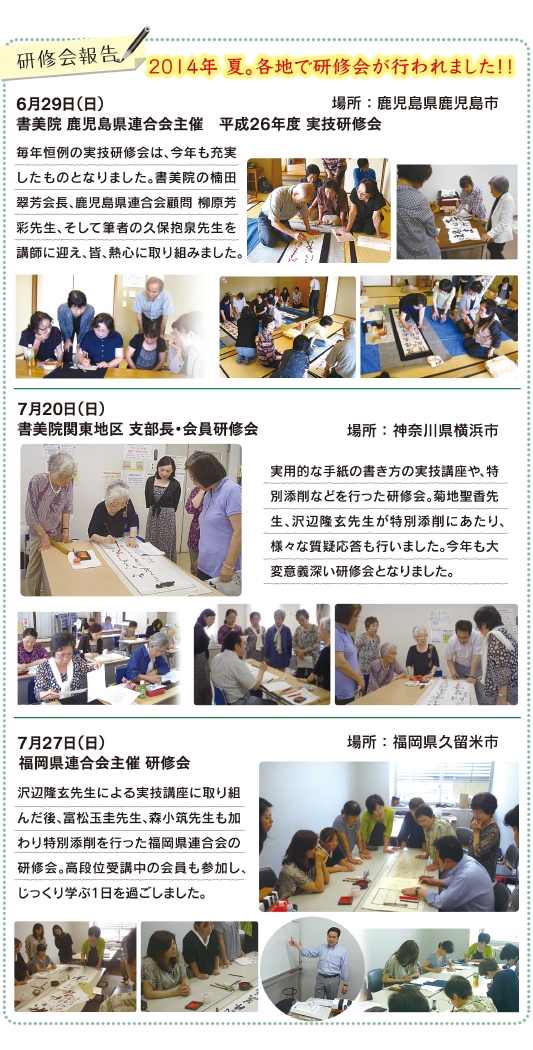 教育書道会 書美院では、全国の教室で指導に当たる支部長や会員様向けに、研修会を行っております。手本の細かい解説や実技指導、裏打ちの手順などを伝える特別講座など、大変有益な会として、毎回各地区にて多くの参加者の方が足を運ばれています。また、和やかな懇親会や、書道用具のお得な販売会などもあり、一年を通して活気あふれるイベントが開催されています。
